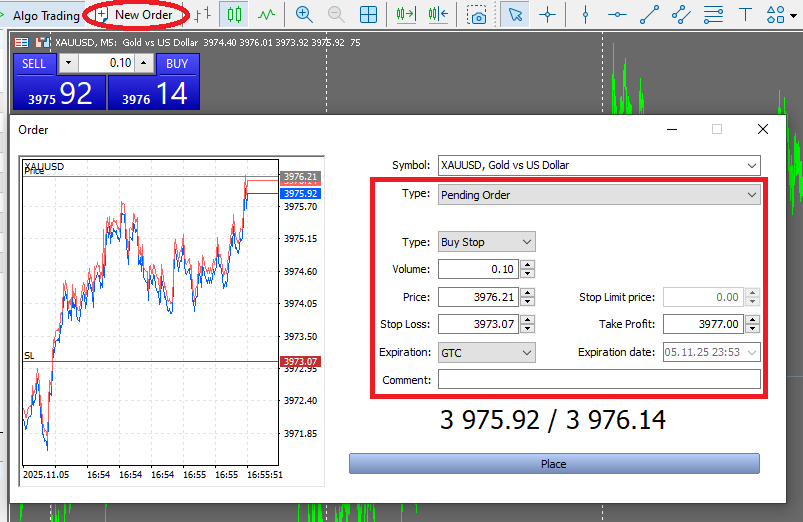MT5 ペンディングオーダー送信画面(買いストップにSLとTPを設定)