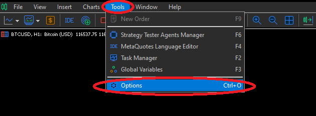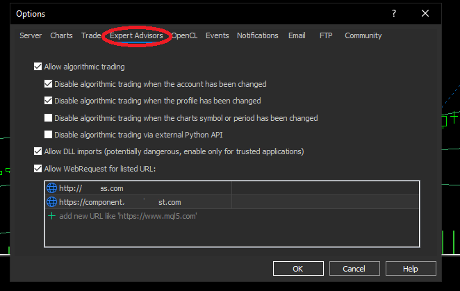 - A. In “Tools > Options > Expert Advisors“, check “Allow WebRequest” and add the specified URL.